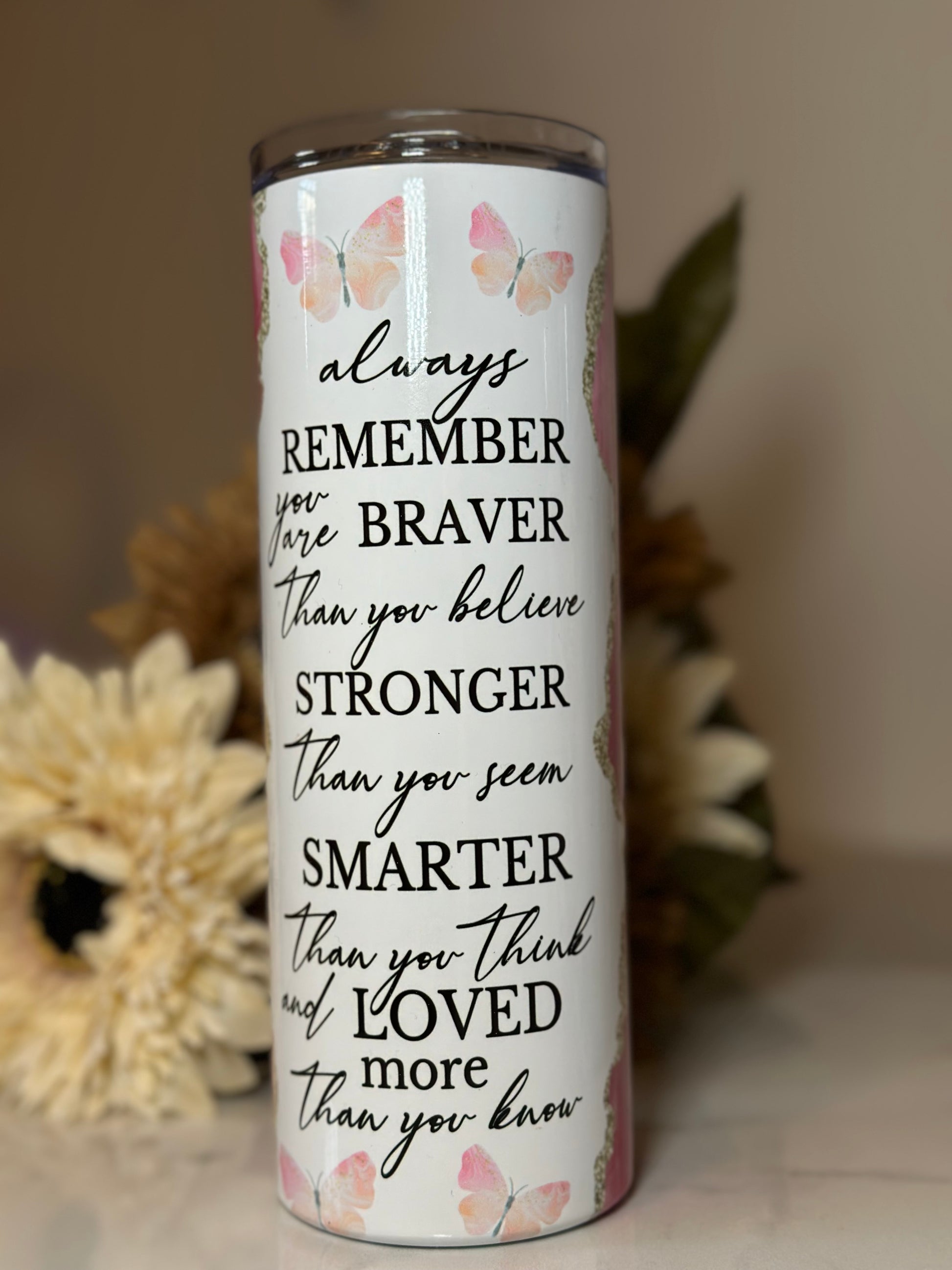 Sip in style and encouragement with this Pink Geode Butterfly 20oz Tumbler! Featuring a stunning marble geode design accented with glitter like gold details and uplifting words “Always remember you are braver, stronger, smarter, and loved more than you know.” This double-walled stainless steel tumbler keeps your drinks hot or cold for hours, while the slim design fits perfectly in your hand or car cup holder. It’s the perfect gift for a friend, sister, or anyone who needs a daily reminder of their strength and beauty.