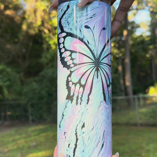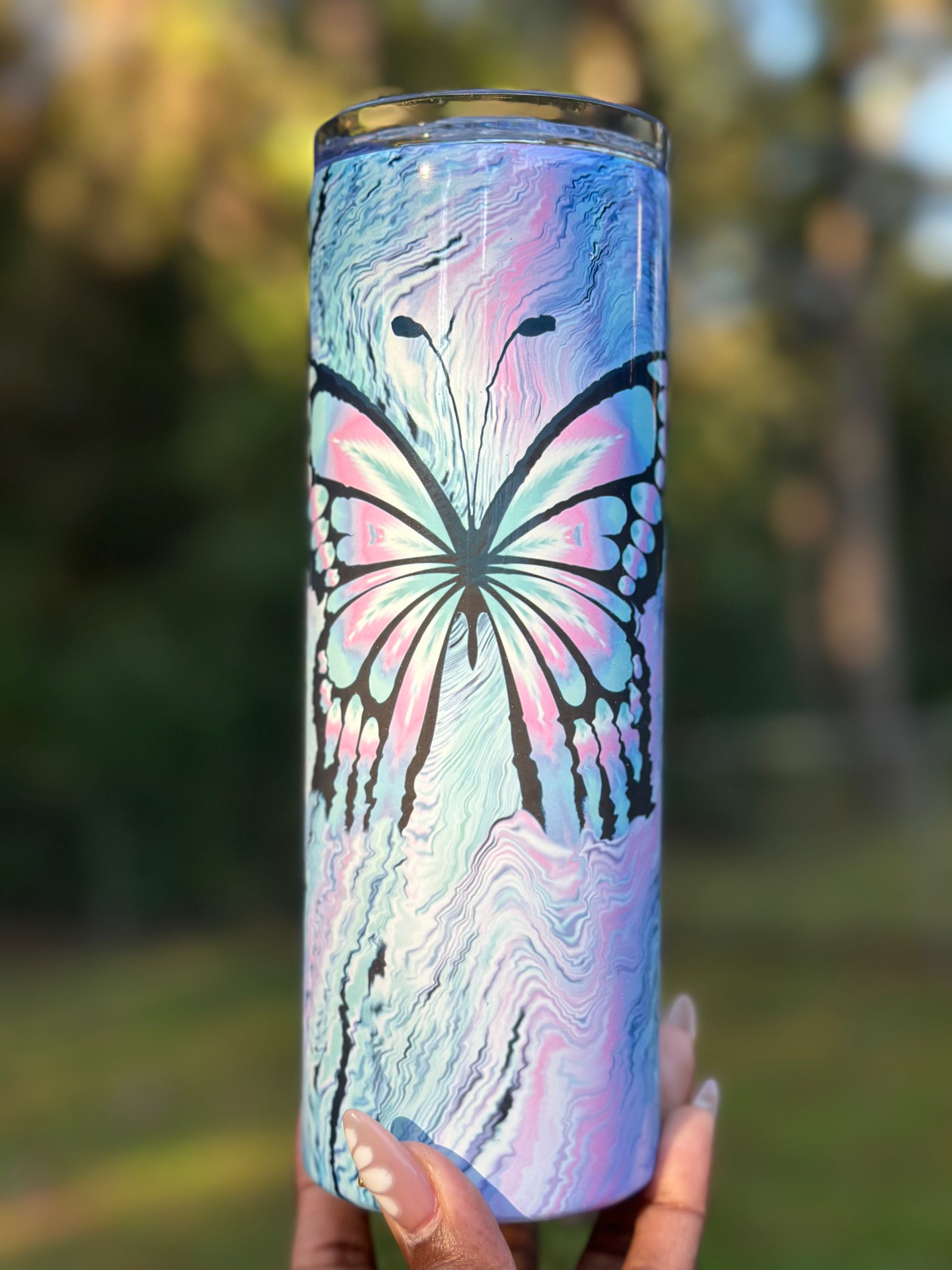 Bring a touch of beauty and elegance to your everyday routine with our Purple Butterfly Tumbler. Featuring a striking black butterfly against a dreamy swirl of purple, blue, and pink hues, this tumbler is both functional and stylish. Made to keep your drinks hot or cold for hours, it’s perfect for coffee, tea, or iced beverages on the go. Whether you’re at work, the gym, or out running errands, this tumbler adds a pop of inspiration to your day.