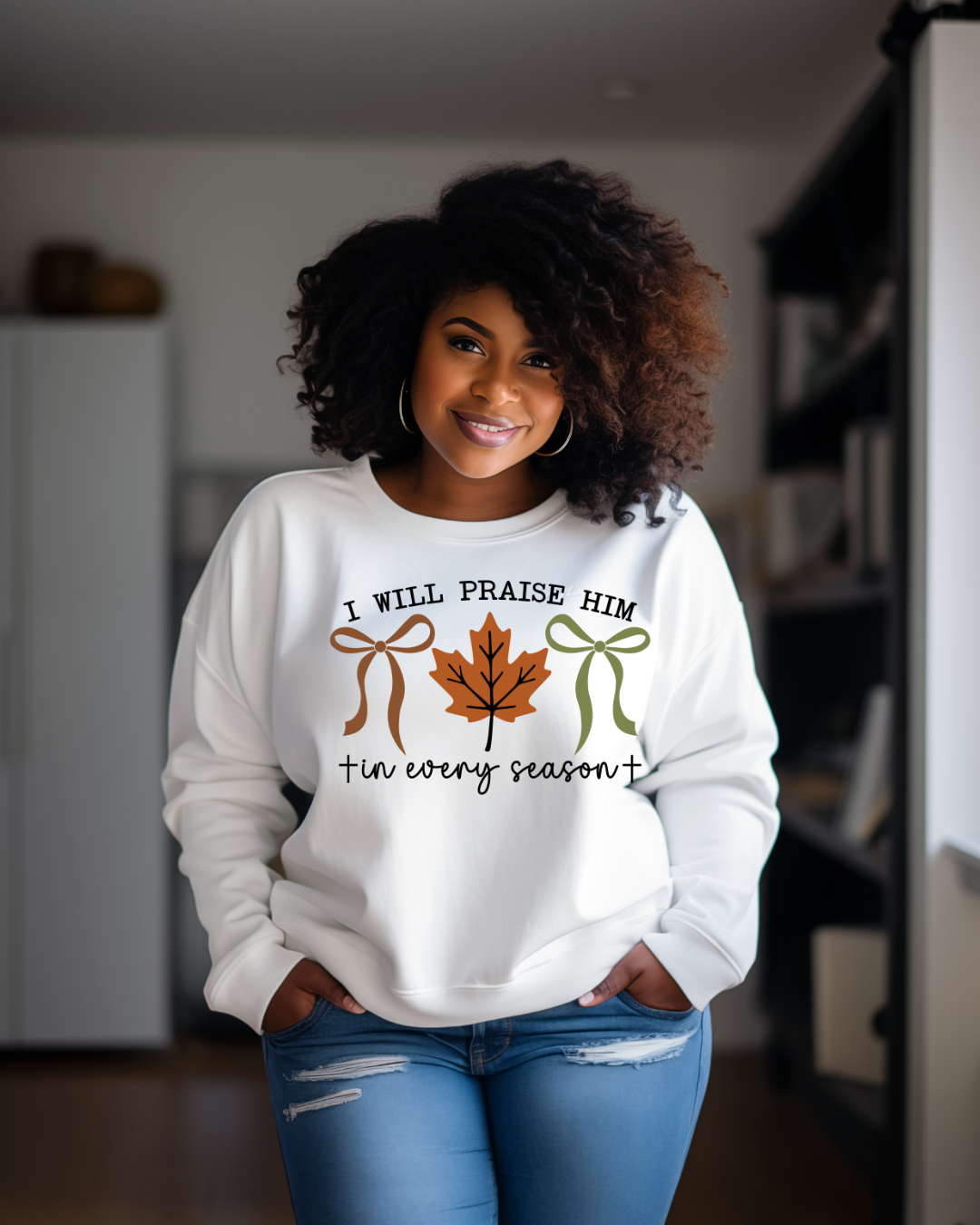 I Will Praise Him in Every Season Sweatshirt | Christian Fall Crewneck | Faith-Based Inspirational Sweater