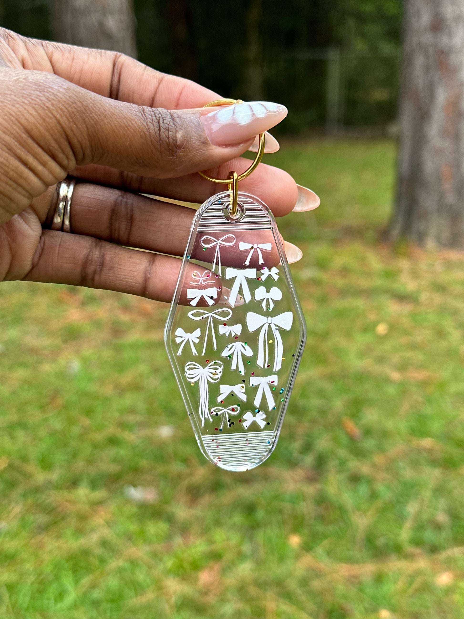 Add a touch of charm everywhere you go with this clear glitter motel style keychain, adorned with dainty pink and Perfect for your keys, tote, or even as a cute accessory for your bag, this keychain is lightweight, stylish, and fun. The soft sparkle detail makes it extra eye catching while the bows bring the sweetest feminine vibe.