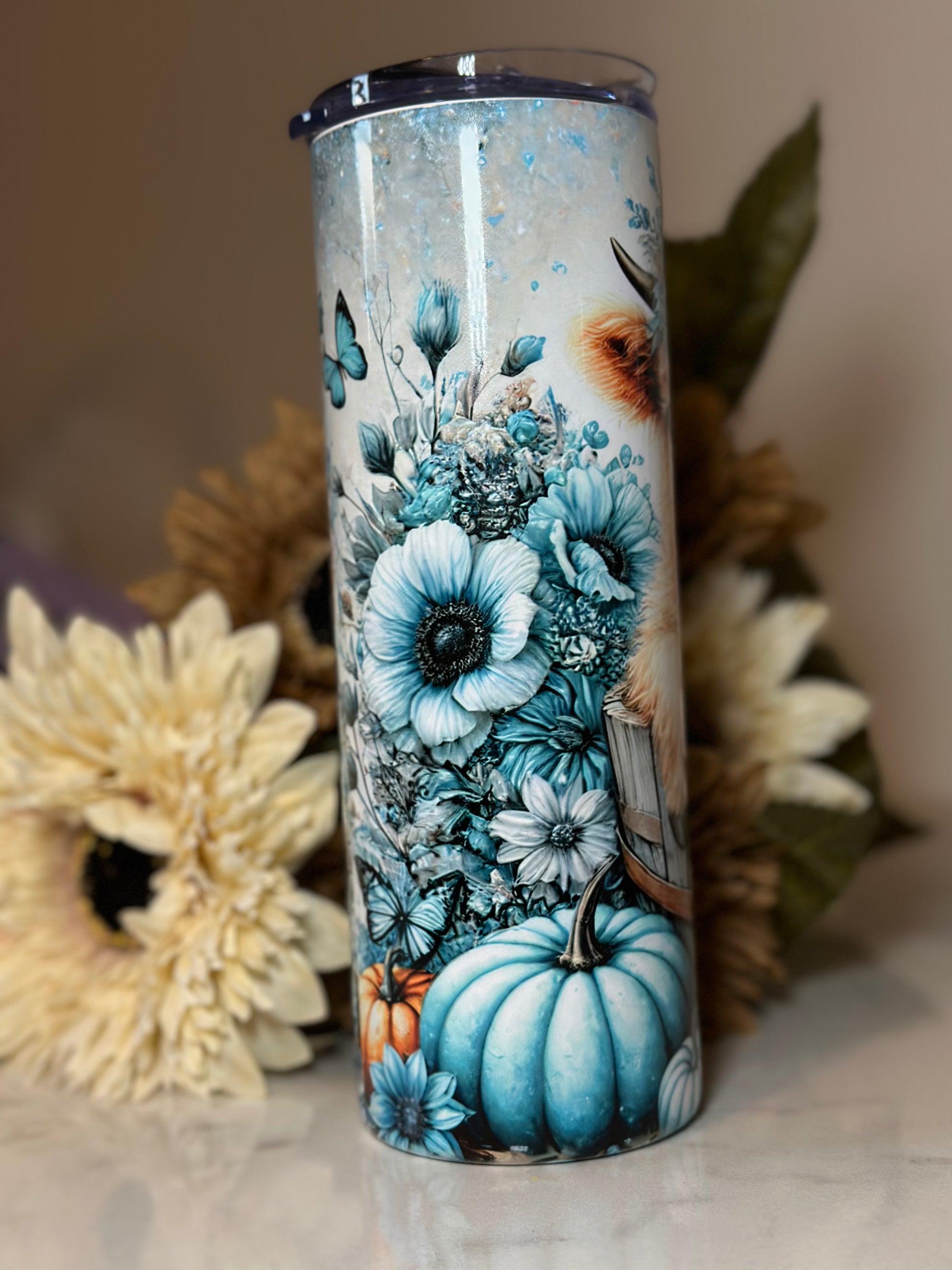 Highland Cow Floral Tumbler – Teal Pumpkin & Butterfly 20oz Cup, Fall Farmhouse Gift for Her